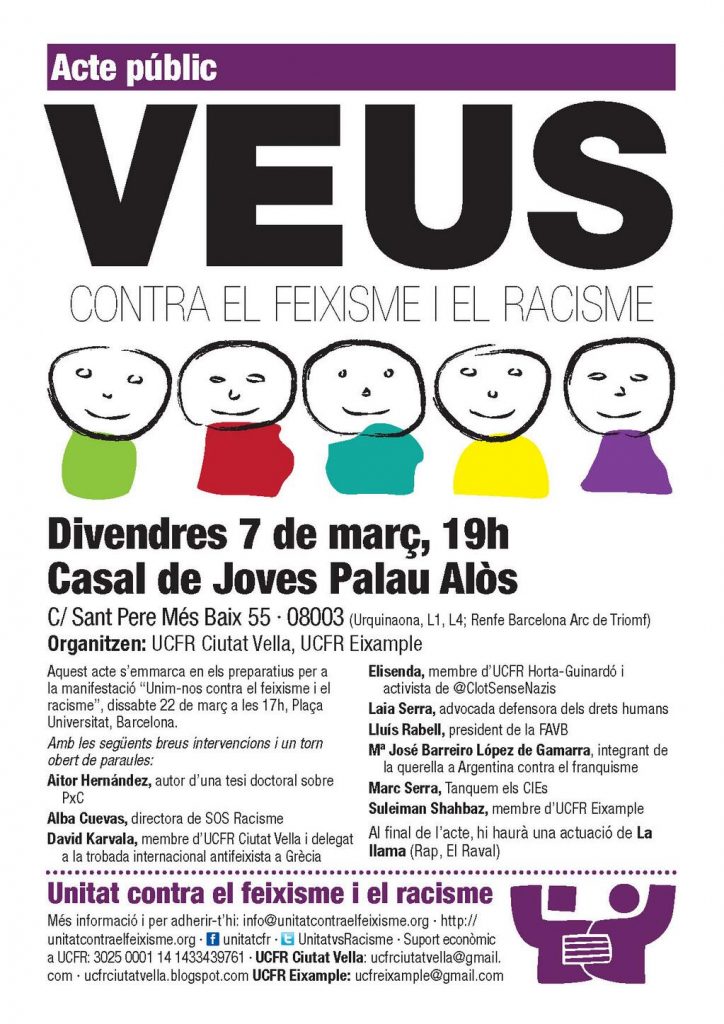 Aquest divendres participem a l’acte públic “Veus contra el feixisme“, organitzat per Unitat contra el Feixisme i el Racisme (UCFR) de Ciutat Vella i Eixample. Un dels actes per donar a conèixer i convocar per la mobilització internacional del 22 de març: “Unim-nos contra el feixisme i el racisme”.