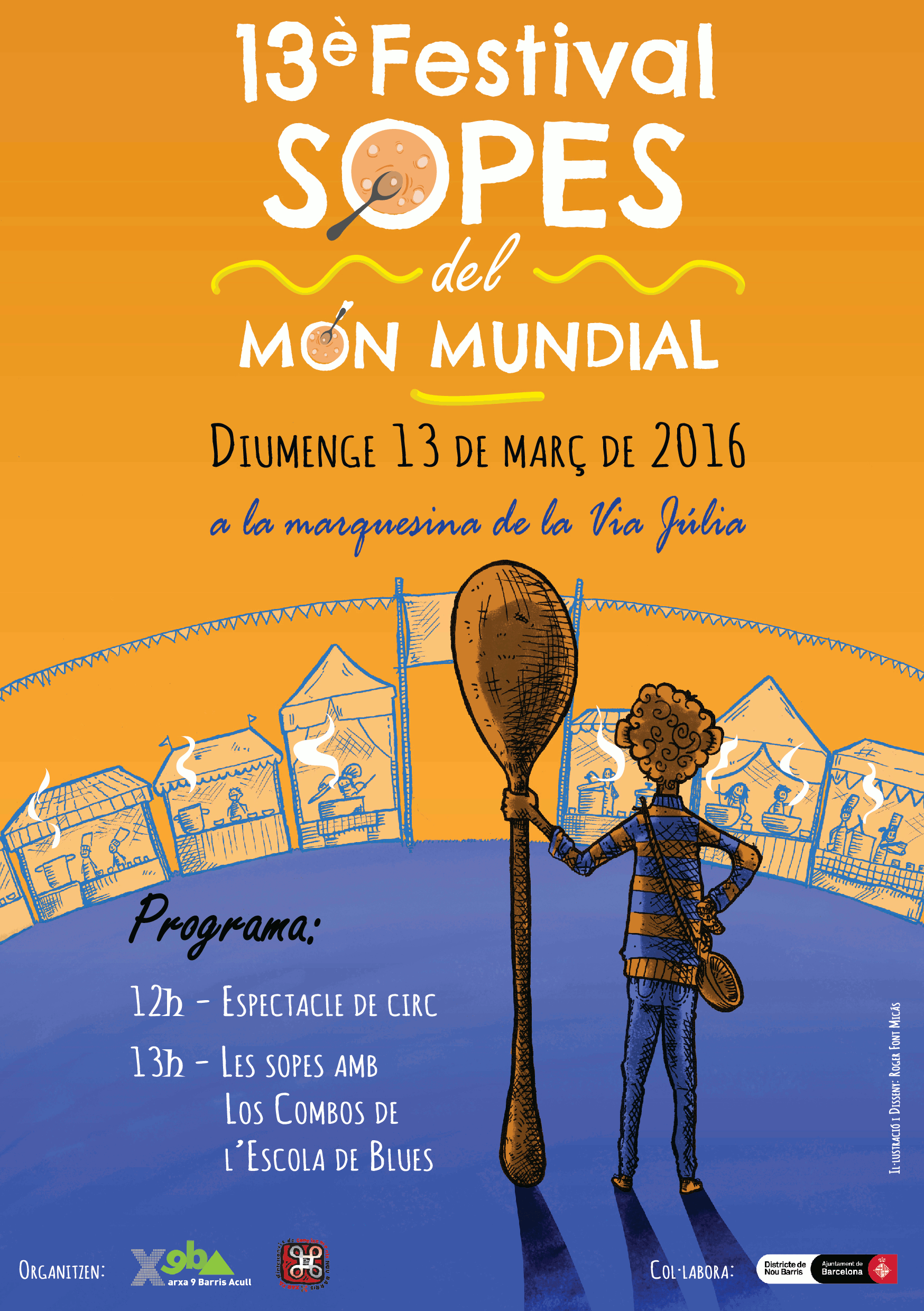 Tot plegat acompanyat de batucada, circ amb la “Cia Vaques” i l’espectacle “Ye Orbayu“, i els combos de l’escola de blues de nou barris… i sopes, mooooltes sopes d’arreu (Andalusia, Argentina, Armènia, Bajo Aragón, Barri Trinitat Nova, Bolívia, Bulgària, Castella, Catalunya, Costa Atlàntica Colombiana, Costa Equatoriana, Equador, El Capcir, Fàbula europea, França, Galicia, Ghana, Guinea Equatorial, Hondures, Itàlia, Leon, Mali, Marroc, Mediterráneo, Nicaragua, Nigèria, Perú, República Txeca, Romania, Sopa original del festival, Suïssa, Valdemorillo, Vietnam, Xina… ) i també sopes reivindicatives (Bullabessa de pobre, S’ha acabat el bròquil, Sopa Revive, Multicultural Sopalsol, “Més porros i menys porres”, Sopa d’equilibris, Sopa de la multiculturalitat, Sopa de pedra, Sopa de Porta’m a l’hort, Sopa torera, Sopa Rojinegra…)