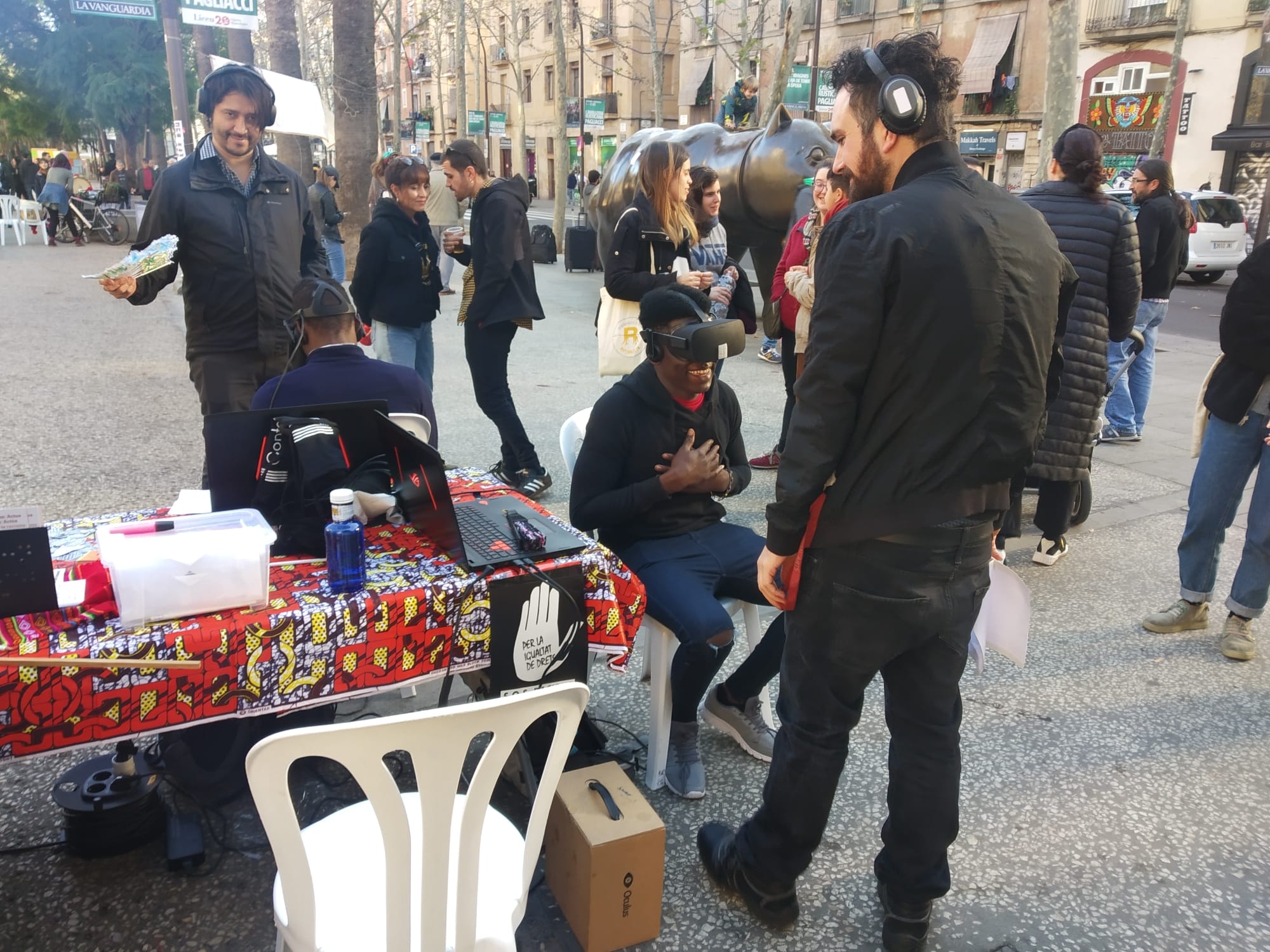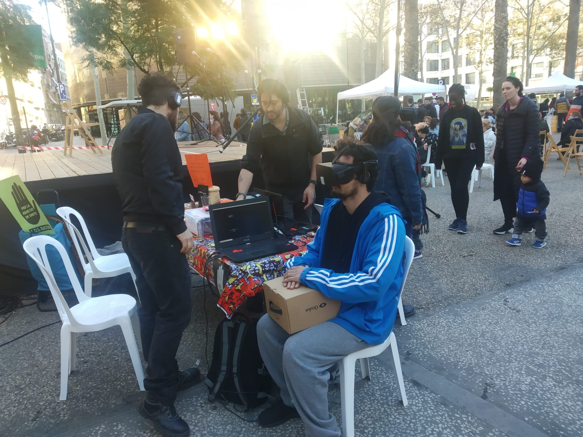 El dia 15 de desembre vam participar a la festa pel Dia Internacional de les persones migrants, organitzada per l’Ateneu del Raval i altres moviments socials de la ciutat, a la Rambla del Raval. #Canviadepell va ser una de les activitats de la jornada. Durant tot el dia, més de 40 persones van poder «viure» -gràcies a la realitat virtual- situacions d’islamofòbia diària.