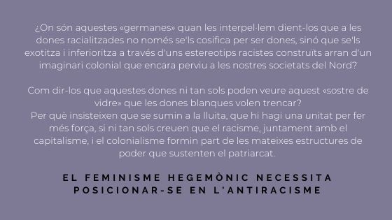 ¿On són aquestes «germanes» quan les interpel·lem dient-los que a les dones racialitzades no només se’ls cosifica per ser dones, sinó que se’ls exotitza i inferioritza a través d’uns estereotips racistes construïts arran d’un imaginari colonial que encara perviu a les nostres societats del Nord? Com dir-los que aquestes dones ni tan sols poden veure aquest «sostre de vidre» que les dones blanques volen trencar? Per què insisteixen que se sumin a la lluita, que hi hagi una unitat per fer més força, si ni tan sols creuen que el racisme, juntament amb el capitalisme, i el colonialisme formin part de les mateixes estructures de poder que sustenten el patriarcat?