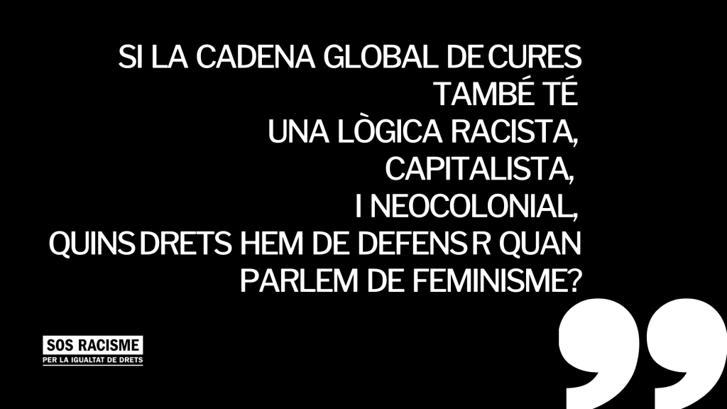 Sempre es parla de posar les cures al centre de la vida en societat, però menys es parla de les que treballen precaritzades en aquest sector. I mentre, en aquest dia de la dona, moltes aniran a les cases d’aquelles dones blanques que s’han “alliberat” a costa de la mercantilització d’aquestes tasques vitals. Són precisament aquelles persones provinents del Sud Global les que han acabat ocupant-se de proveir les cures i paradoxalment, les seves pròpies famílies es queden a càrrec d’una altra dona, generalment més empobrida. Aquesta lògica racista i capitalista, coneguda també com les “cadenes globals de les cures”, té com a objectiu final cobrir les necessitats de les famílies blanques de classe mitjana/alta dels països del Nord.