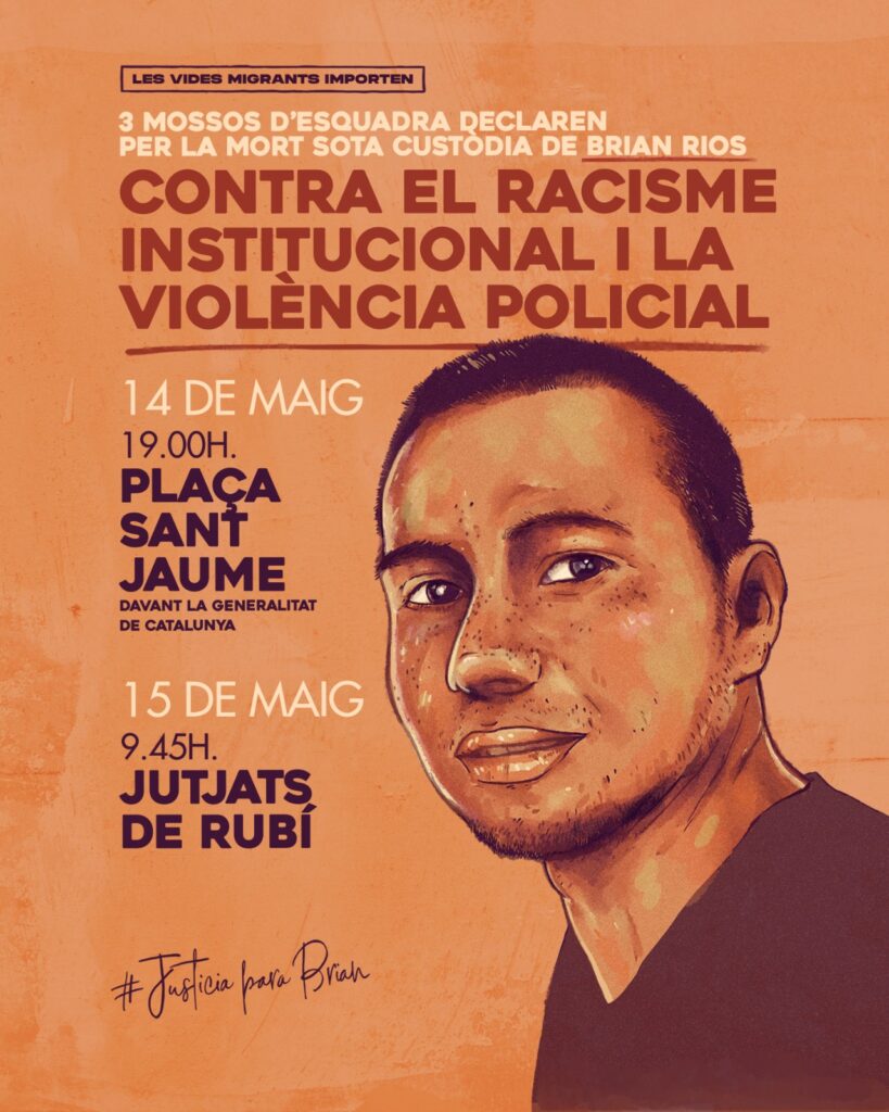 Les conductes individuals i col·lectives que van conduir a la mort de Brian es dirimiran en un jutjat. I en aquest procés també tocarà estar, per això el proper 15 de maig al matí ens concentrarem davant dels jutjats de Rubí per acompanyar la família de Rios mentre declaren com a investigats per la seva mort tres Mossos d’Esquadra.