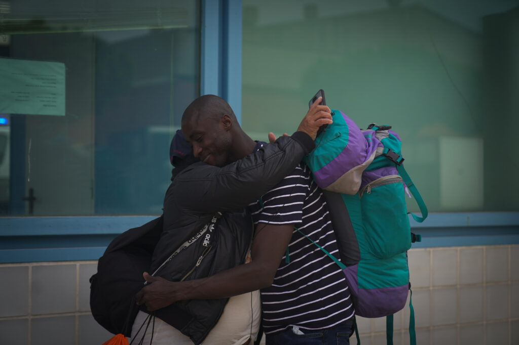 Dos internos se abrazan tras conseguir la libertad frente al Centro de Internamiento de Extranjeros de Barcelona J.T.P.