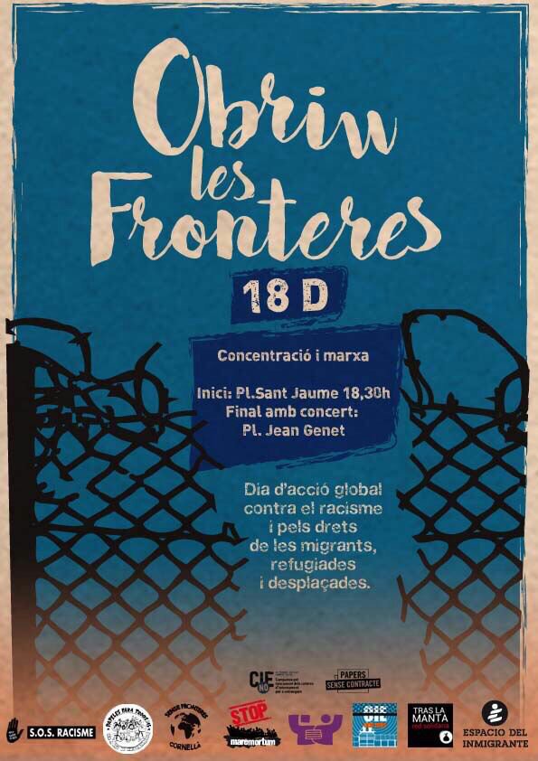 Obriu les fronteres és el crit de les dones i els homes, nens i nenes detingudes a la fronteres; entre Grècia i Macedònia, entre l’Estat espanyol i el Marroc, entre Mèxic i USA… La seva protesta és símbol de tot el que demanen altres milers i milers de persones en migració, detingudes arreu del món: Obriu les fronteres! és i ha de ser el nostre lema.