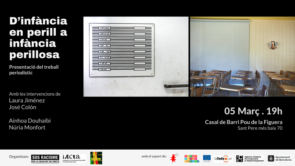 SOS Racisme Catalunya, l’espai Did L3onf i la cooperativa IACTA,us convidem a l’acte “D’nfància en perill a infància perillosa“, on es presentarà un treball periodístic que aborda les polítiques del racisme institucional i els seus processos de criminalització que continuen definint de manera vertebral els itineraris de la infància i de l’adolescència migrant. El projecte elaborat per la periodista Laura Jiménez, el fotoperiodista José Colón i la documentalista Hajar Boujtat, cerca un canvi de mirada mediàtica que entengui el funcionament d’un sistema migratori i de protecció, llarg i articulat, que no sol considerar als menors migrants com a nens ni joves.