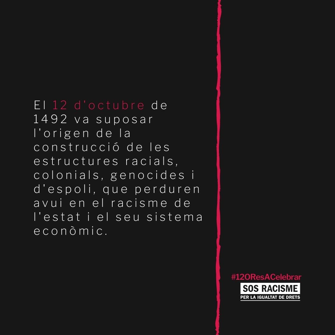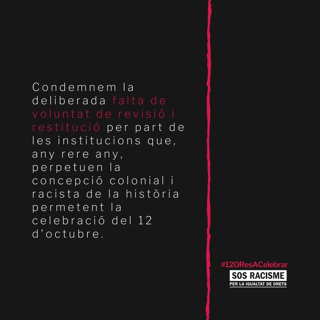 Per tot això, condemnem la deliberada falta de voluntat de revisió i restitució per part de les institucions que, any rere any, perpetuen aquesta concepció colonial i racista de la història permetent la celebració del 12 d’octubre. Així mateix, mostrem la nostra preocupació per la presència de grups feixistes i la impunitat amb què se’ls permet estendre el seu discurs d’odi. Exigim urgentment a les institucions que no tolerin aquests actes en cap lloc de Catalunya.