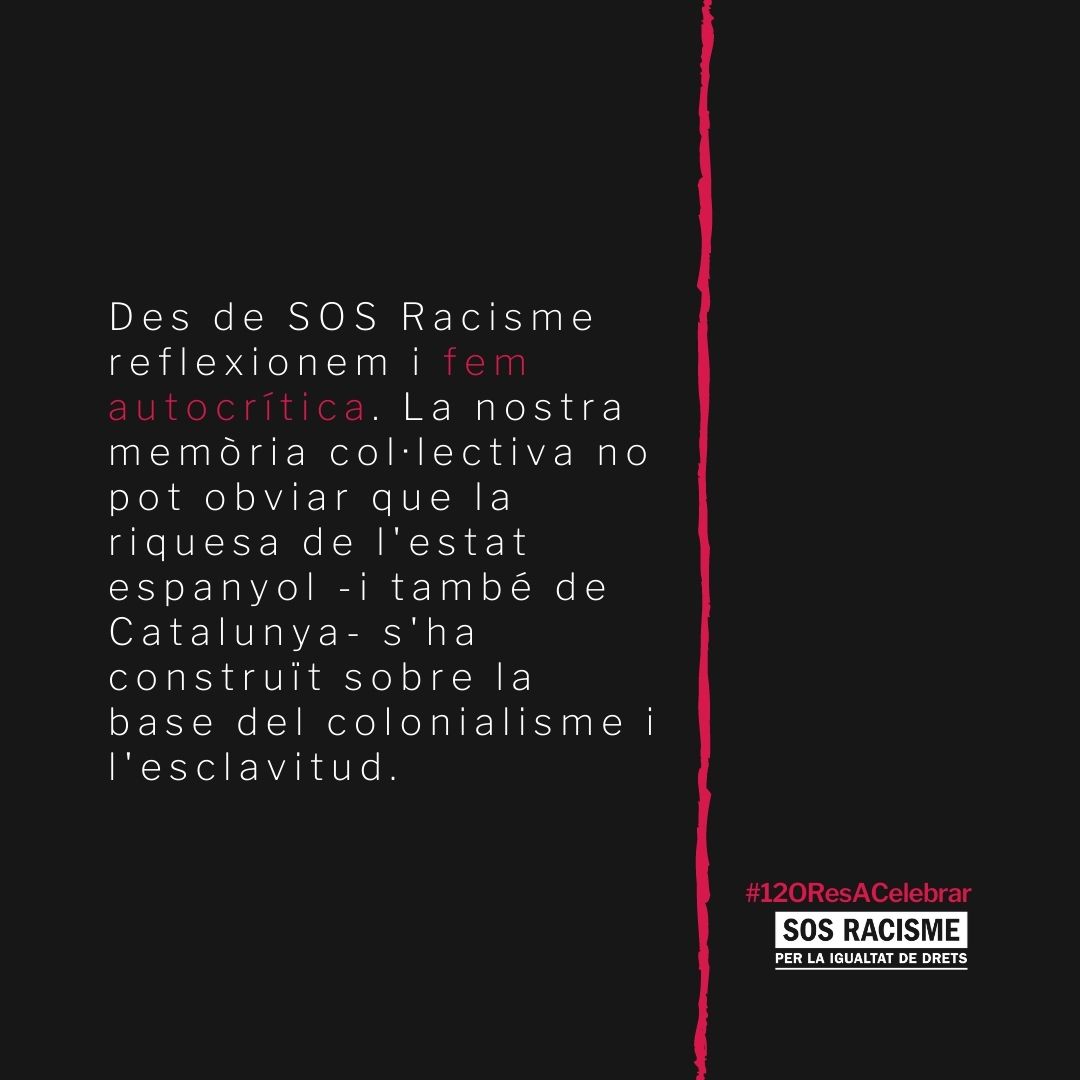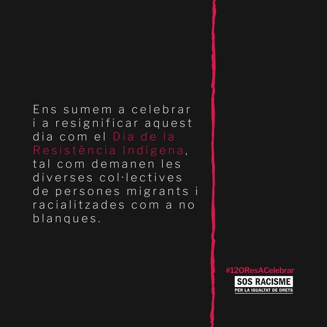 Desde SOS Racisme Catalunya, como entidad antirracista y en defensa de los derechos humanos, hoy reflexionamos y hacemos autocrítica como parte de esta sociedad y tomamos consciencia de que estas lógicas coloniales siguen aún presentes. Nuestra memoria colectiva no puede obviar que la riqueza del estado español -y también de Cataluña- se ha construido sobre este pasado colonial y esclavista. Nos sumamos a celebrar y a resignificar este día como el Día de la Resitencia Indígena, tal y como demandan las diversas colectivas de personas migrantes y racializadas como no blancas.
