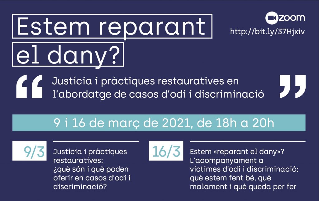 En la primera, parlarem de justícia i pràctiques restauratives, introduint-les com a model de justícia, enfocament de treball i eines d’intervenció, així com de les aplicacions pràctiques que hi ha a Europa davant de delictes d’odi i discriminació –especialment, però no només, en relació al col·lectiu LGTBQI-, i de l’experiència que tenim a Catalunya.