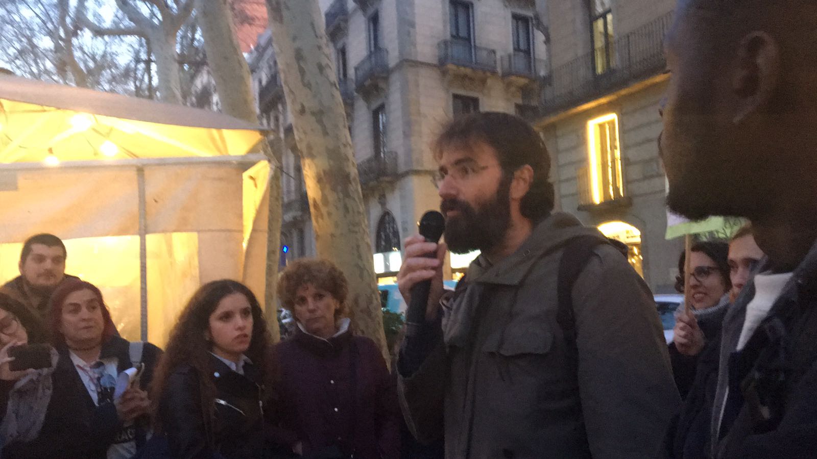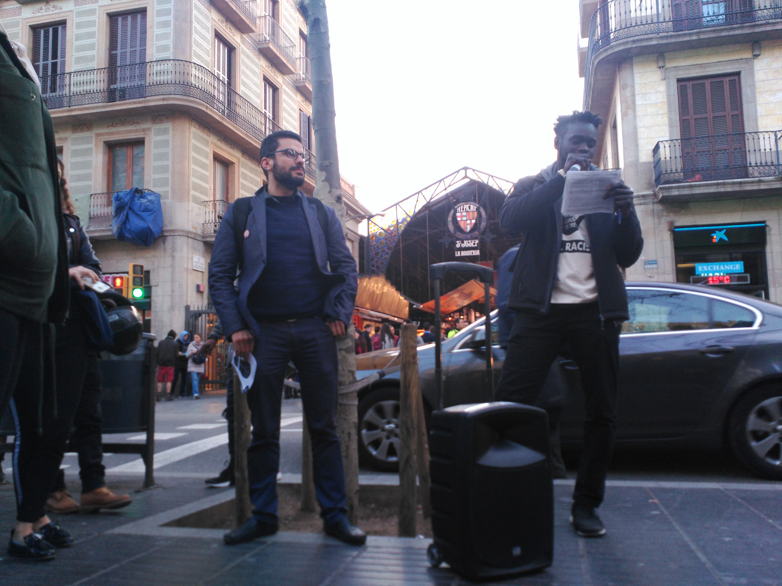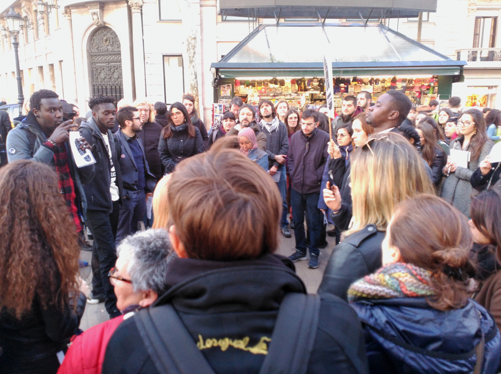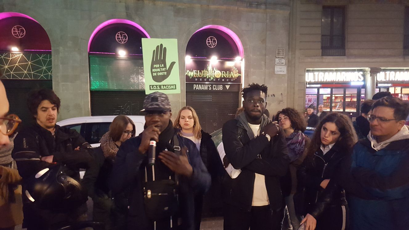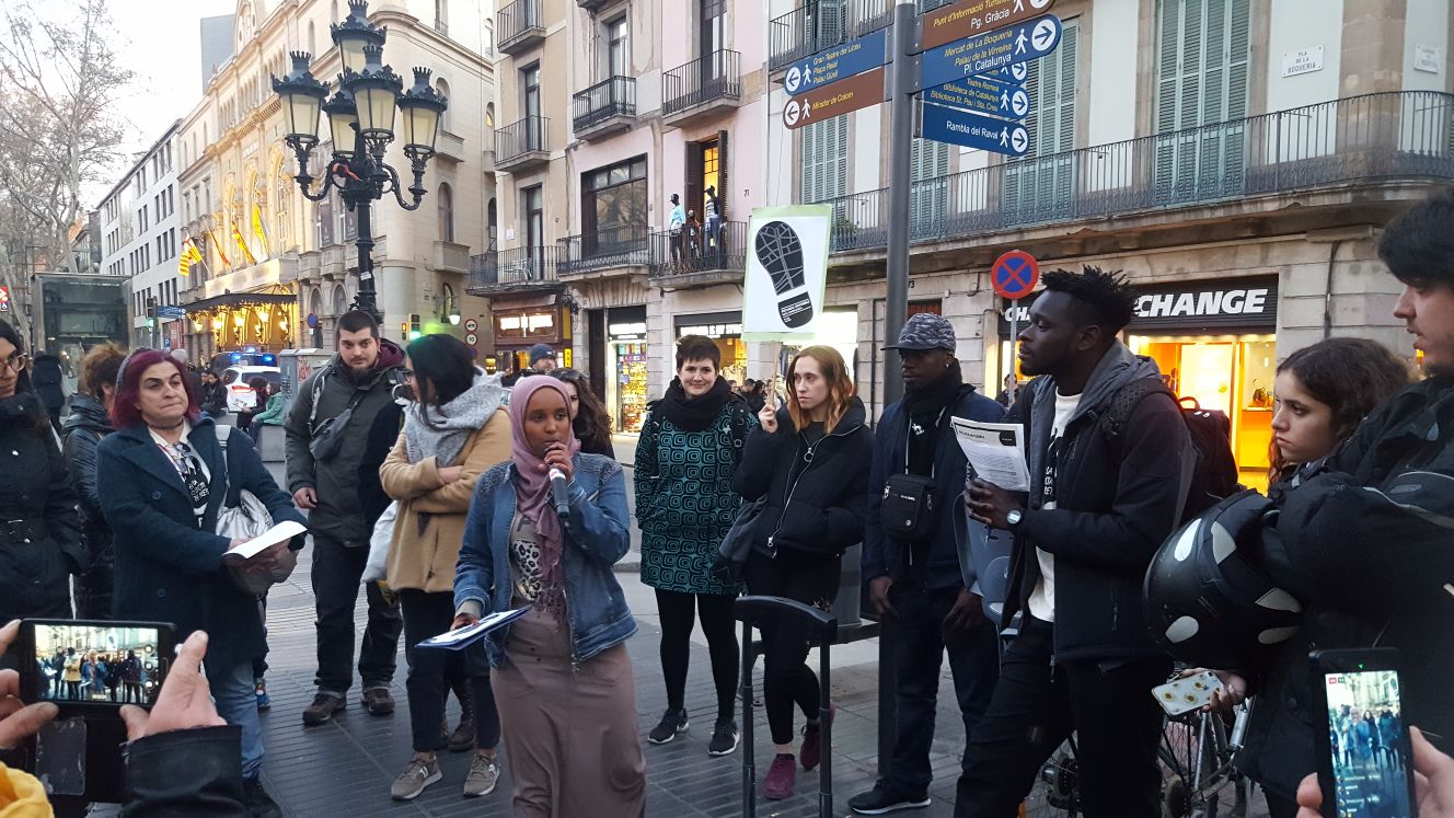 Van començar la ruta molt a prop de l’intercanviador del metro de Plaça Catalunya exposant la realitat de la persecució policial als venedors ambulants no autoritzats, amb el Sindicat Popular de Venedors Ambulants, del discurs d’odi dins i fora de les xarxes socials, amb l’Euroàrab Centre; de la buroexclusió i la Llei d’Estrangeria als peus del monument a Colom, amb l’Espacio Inmigrante. L’activivista Khadra Ahmed va exposar el seu cas i la seva persistent lluita contra les identificacions per perfil ètnic, l’advocat Josep Granados va explicar el cas d’en Kamal Uddin just davant de la comissaria situada a La Rambla, on un agent de la Guàrdia Urbana el va agredir. El seu cas va exemplificar les enormes dificultats que ens trobem en els casos de violència i discriminació policial, i el DJ i productor musical Alex Drammeh va explicar des de la seva experiència com es discrimina en l’accés a locals d’oci a Barcelona.