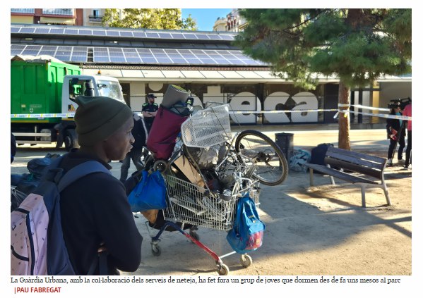 La Guàrdia Urbana, amb la col·laboració dels serveis de neteja, ha fet fora un grup de joves, majoritàriament d’origen subsaharià, que dormen des de fa uns mesos al parc Joan Miró. El col·lectiu Esquerra Eixample Acull denuncia que el Consistori els fa fora sense oferir cap solució