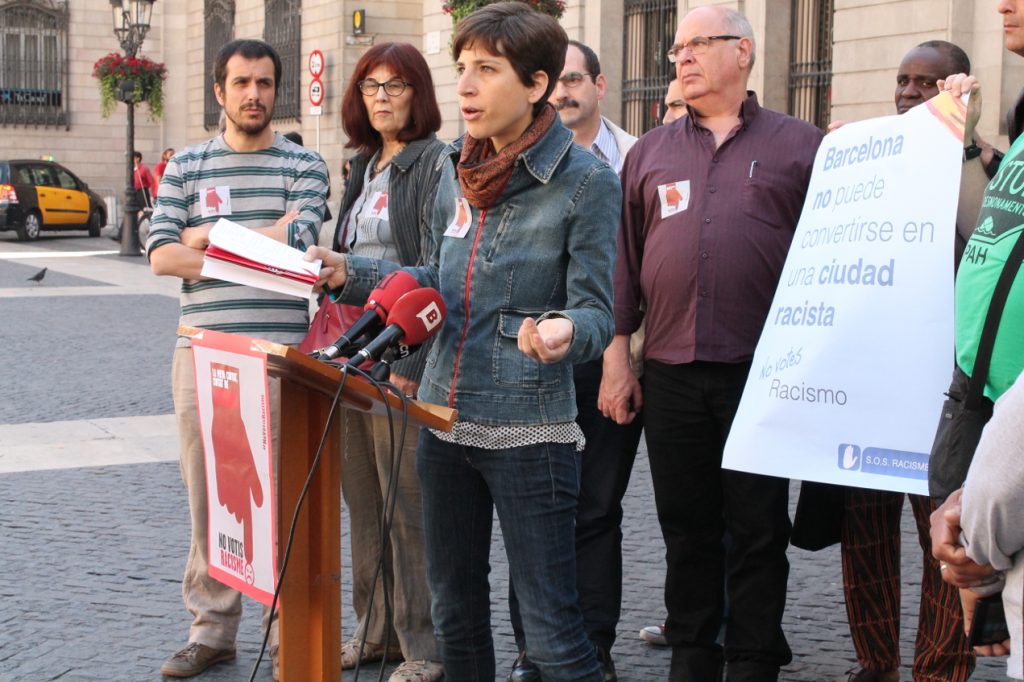 Els i les representants de les entitats s’han reunit davant de l’Ajuntament de Barcelona, per simbolitzar el perill que corre aquesta institució davant el discurs incendiari de l’alcaldable del PP al municipi, un dels més radicals del partit. Per mostrar-ho, han sostingut un cartell amb el lema «Barcelona no puede convertirse en una ciudad racista. No votes Racismo», versionant les octavetes que va repetir en Fernández Díaz al Raval («El Raval no puede convertirse en un gueto islàmico. Vota Fernàndez Díaz»).