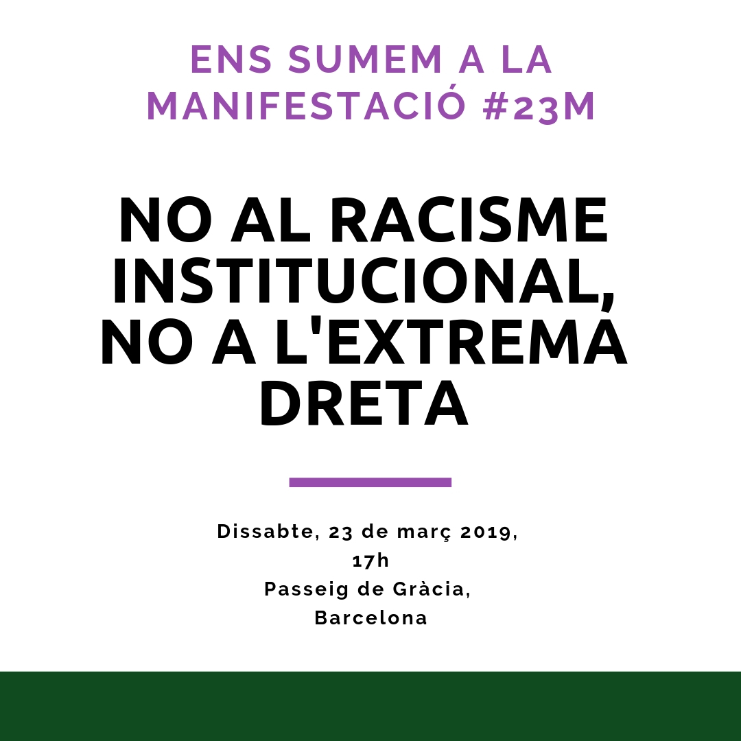 A Barcelona ens sumem a la manifestació unitària de dissabte, 23 de març de 2019, perquè volem posar l’antiracisme en un context polític més ampli. En el marc del Dia Internacional contra el Racisme, l’antiracisme no pot quedar invisibilitzat per altres reivindicacions!