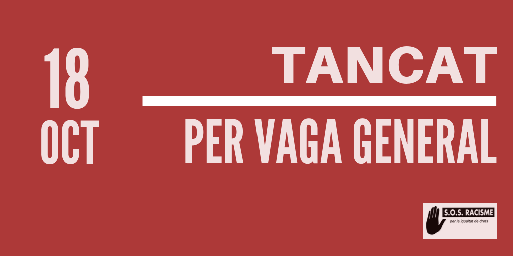 Us informem que des de SOS Racisme Catalunya donem suport a la vaga general de divendres 18 d’octubre convocada per la Intersindical-CSC, i per tant l’entitat romandrà tancada tot el dia.