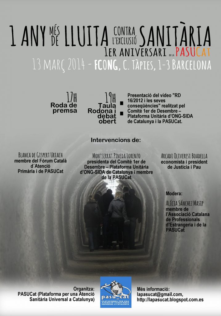 El mes de març del 2012 es va constituir la Plataforma per una Sanitat Universal a Catalunya (PASUCat), que aglutina entitats i organitzacions catalanes molt diverses amb un objectiu comú: treballar contra l’apartheid sanitari que es va imposar amb els canvis legislatius espanyols i catalans a finals del 2011.